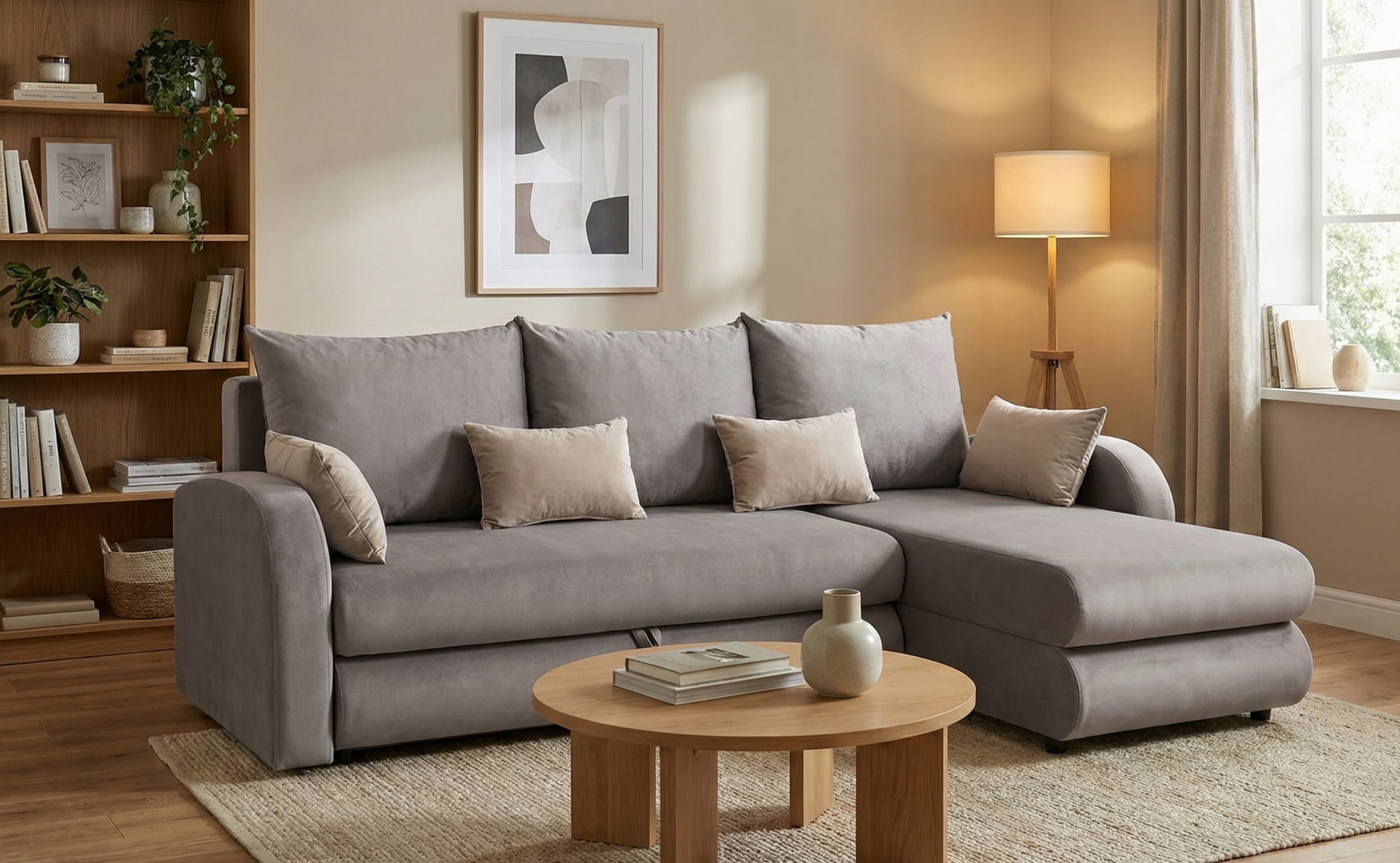 Prezentowany przez nas narożnik można rozłożyć, dzięki czemu otrzymują Państwo bardzo wygodną strefę do spania o wymiarach 210 x 165 cm. We wnętrzu znajdują się 2 pojemniki na pościel.