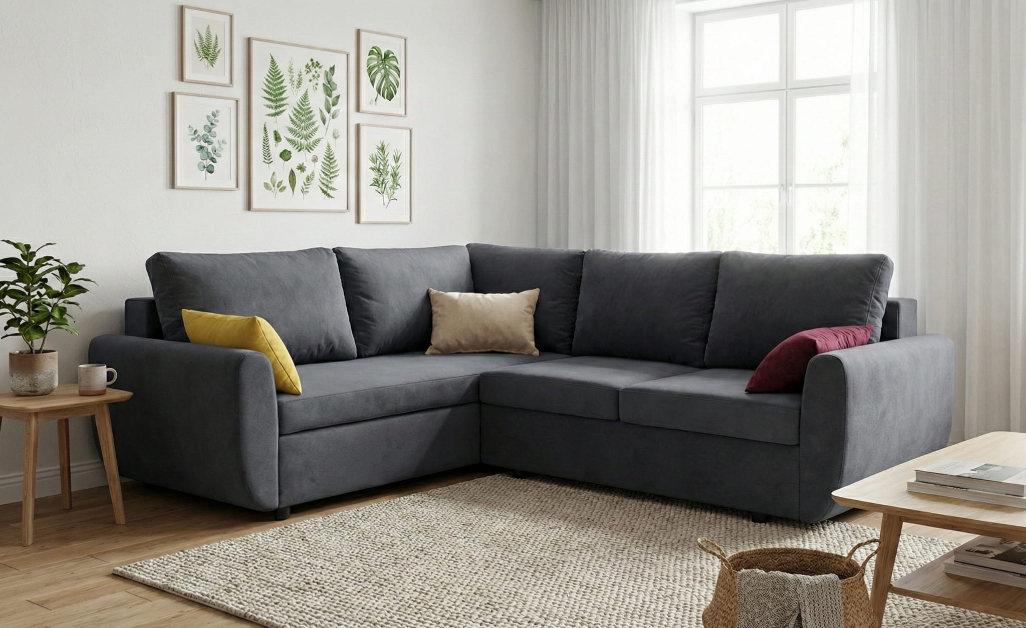 Narożnik posiada funkcję spania i pojemnik na pościel. W zestawie są też 2 ozdobne poduszki. Wybierz je w kontrastowym do reszty tapicerki kolorze, a będą dodatkową ozdobą mebla. Jeżeli obawiasz się wprowadzić zbyt dużo koloru do wnętrza, ale marzy Ci się ten najmodniejszy w danym sezonie, to taki niewielki akcent kolorystyczny spełni Twoje oczekiwania i nie przytłoczy przestrzeni.
