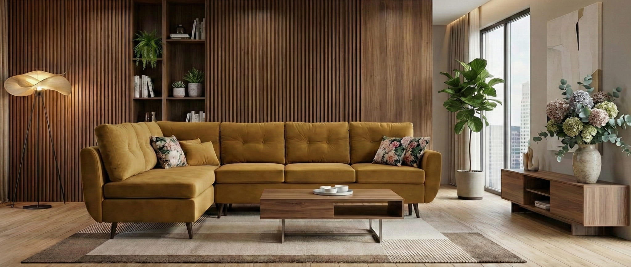 - dzięki obitemu tkaniną tyłowi narożnika mogą Państwo ustawić go również na środku pokoju (mebel wolno stojący)